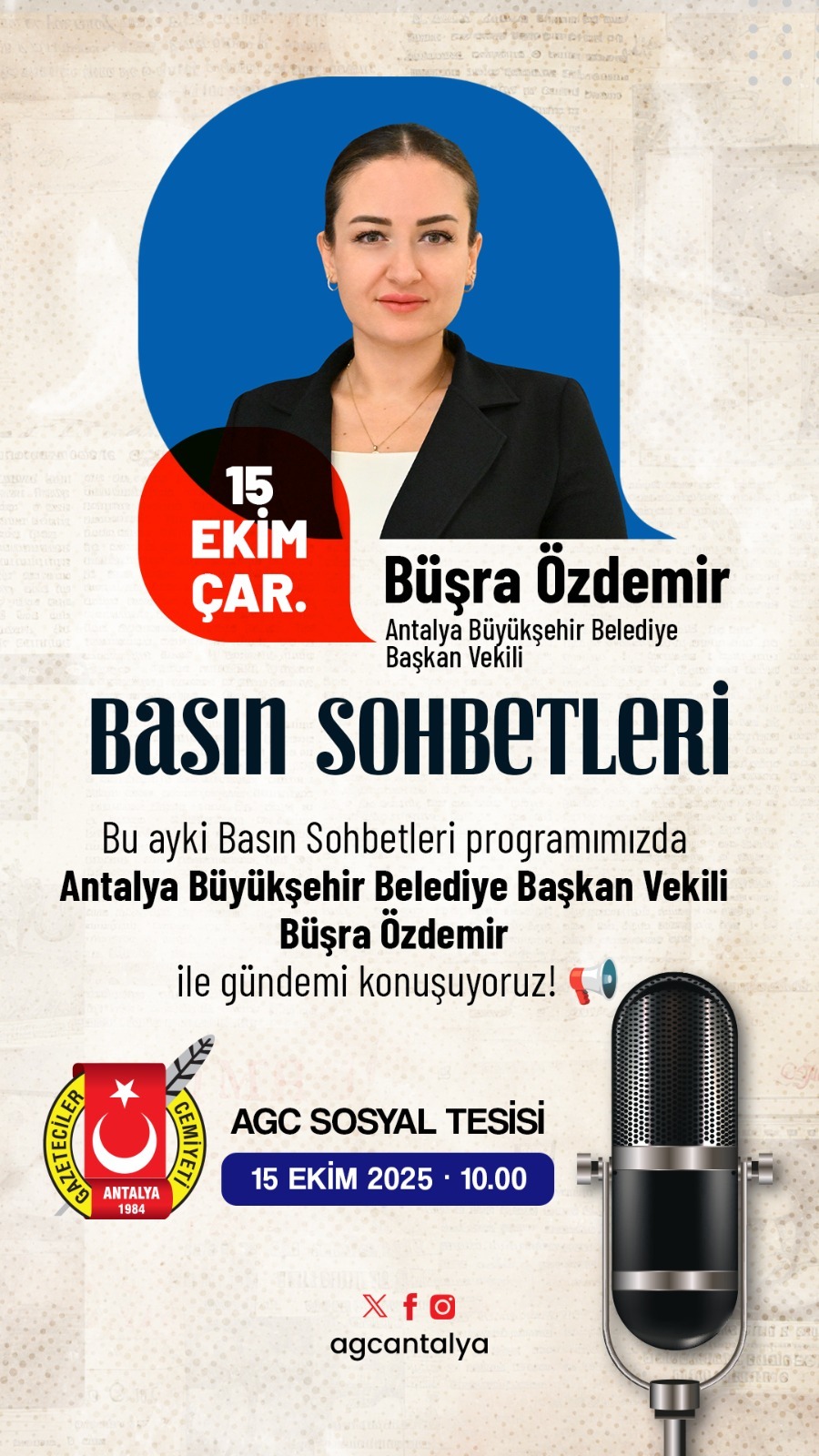 Antalya Gazeteciler Cemiyeti (AGC) tarafından düzenlenen “Basın Sohbetleri” devam ediyor. Basın ve toplum arasındaki bağı güçlendirmeyi ve kentin nabzını tutmayı hedeflediğimiz etkinlik serimizin konuğu, Antalya Büyükşehir Belediye Başkan Vekili Büşra Özdemir oldu.